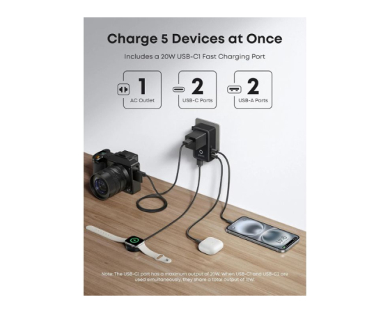 Napajajte 5 naprav hkrati: Polnite pet naprav istočasno prek AC-vtičnice, dveh USB-A priključkov in dveh USB-C priključkov, pri čemer eden omogoča 20 W hitro polnjenje, da vse ostane učinkovito napajano. iPhone 16 lahko napolnite do 50 % v samo 28 minutah.