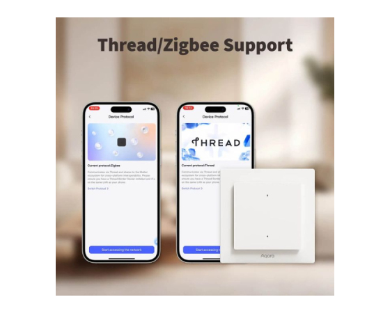 Stikalo Aqara Light Switch H2 EU podpira Matter over Thread za povezavo s tretjimi ekosistemi in Zigbee za integracijo z Aqara Home. Uporabniki lahko izbirajo med Thread za širšo združljivost ali Zigbee za dostop do Aqara funkcij, kot sta MARS tehnologija in nastavitve LED osvetlitve.