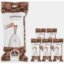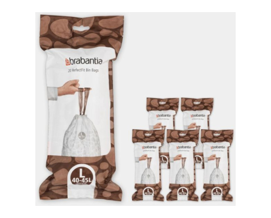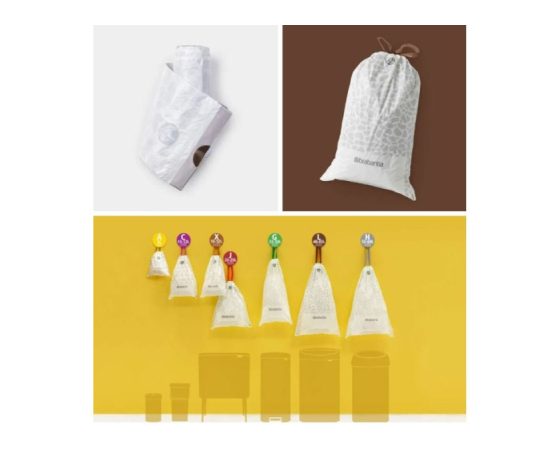 Brabantijine vrečke za odpadke, ki se prilegajo posameznim vrstam, so na voljo v velikem pakiranju z razpršilnikom, ki deluje kot škatla za robčke. Gre za ravno vrečko z veliko odprtino. Enostavno vzemite novo podlogo in jo izvlecite; podloge niso pritrjene druga na drugo, kot večina zvitih vrečk za odpadke.