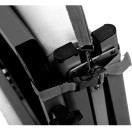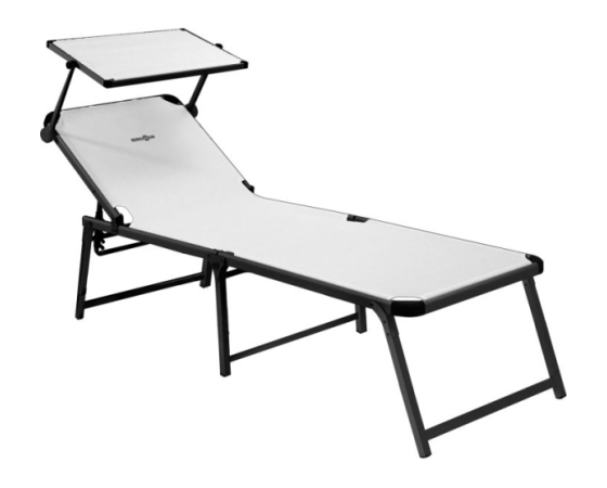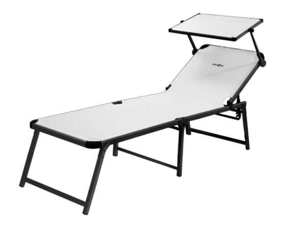 Zelo udobno ležišče s stabilnim, zložljivim okvirjem na treh nogah iz eloksiranega aluminija, visoko ležalno površino (V = 48 cm) iz tkanine Syntex Plus, odporne na vremenske vplive, in nastavljivim naslonom za hrbet. Dobavi je priložen praktičen nadstrešek za sončenje.