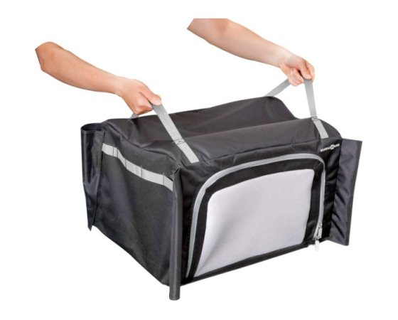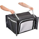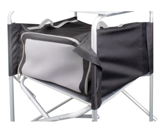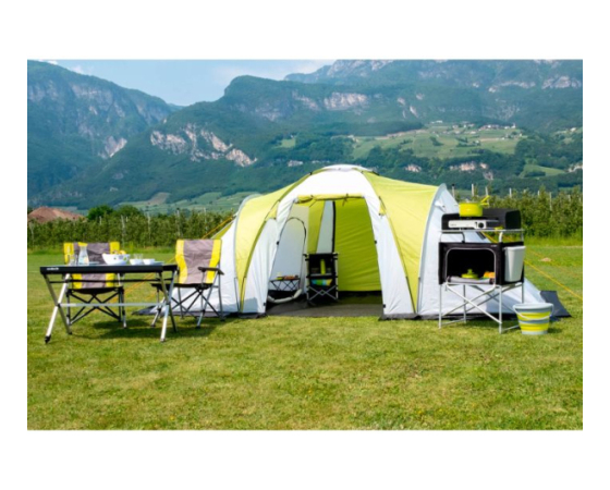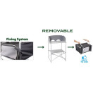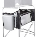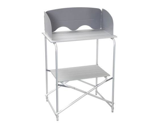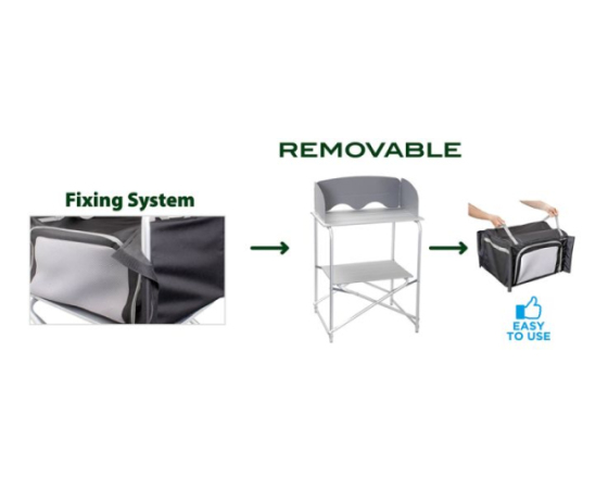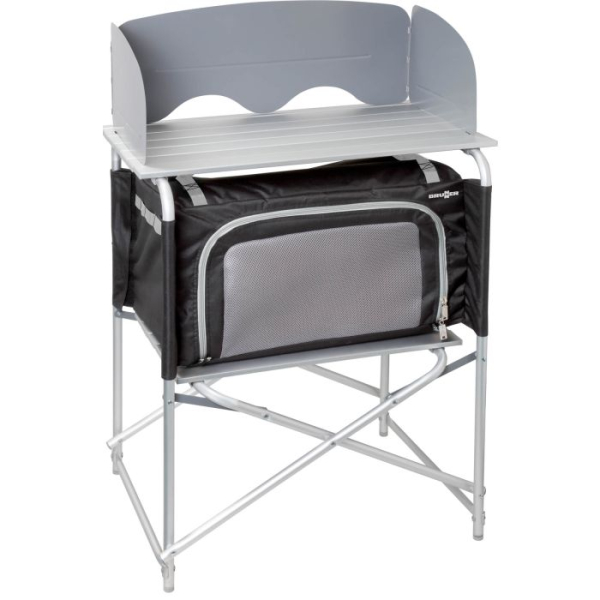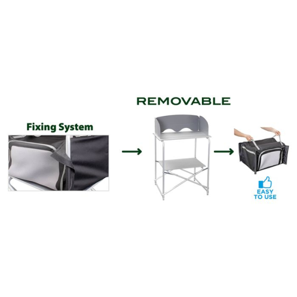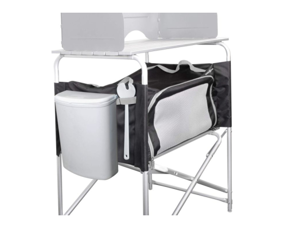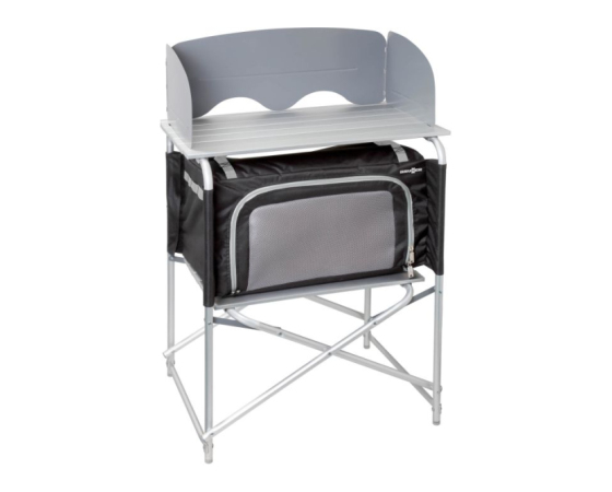 Zložljiva kuhinja za kampiranje z zložljivo delovno ploščo, spodnjo polico s snemljivo omarico iz blaga in uporabno zaščito pred vetrom in škropljenjem. Ena noga z nastavitvijo višine. Hitro in enostavno sestavljanje in razstavljanje. Zelo kompakten, ko je zaprt, zato ga je enostavno pospraviti. V kompletu s trpežno torbo za prenašanje.