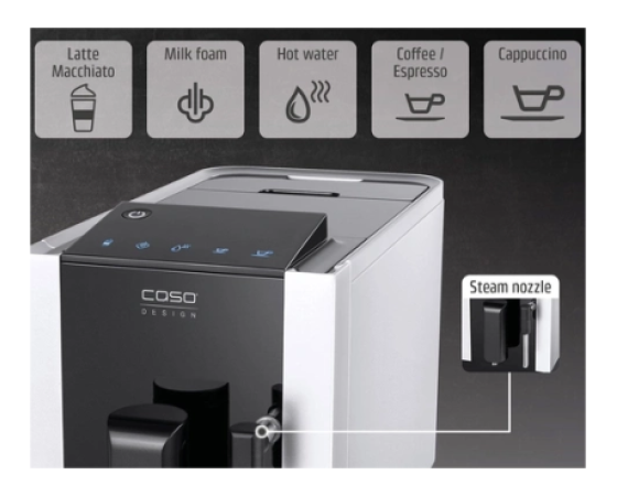 Z zmogljivo parno šobo lahko pripravite fino, kremno mlečno peno za okusne kavne specialitete. Naj bo to kremast cappuccino ali popolno plasten latte macchiato – CASO Café Crema One uresniči sanje o popolni mlečni peni. Funkcija vroče vode omogoča tudi enostavno pripravo čaja ali Americana.