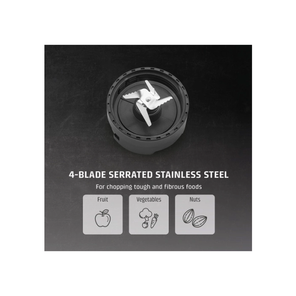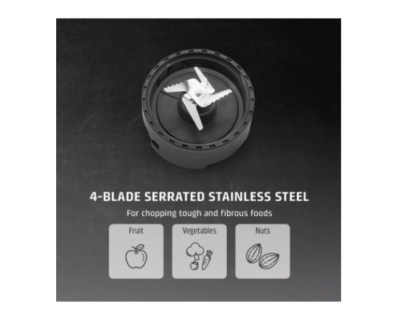 Srce mešalnika je vrhunski 4-kraki nož iz nerjavnega jekla z nazobčanimi robovi. Ta robustni rezalni sistem zlahka obvladuje vlaknaste in trše sestavine ter zagotavlja gladke, kremaste rezultate. Od osvežilnih napitkov do okusnih pomak – natančno in močno mešanje dvigne vaše kreacije na višjo raven.