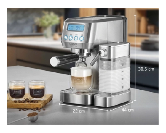 Z ročnim espresso aparatom EspressoGourmet Latte blagovne znamke CASO Design si lahko vrhunsko kavno izkušnjo pričarate kar doma. Ta visokokakovosten aparat iz nerjavečega jekla združuje eleganten dizajn z najsodobnejšo tehnologijo in omogoča pripravo polnega espressa, kremnega cappuccina, okusnega latte macchiata ter številnih drugih kavnih specialitet na osnovi espressa.