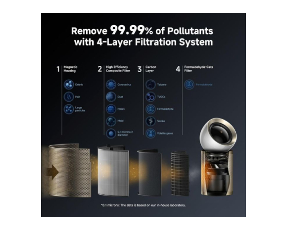 Zajame delce že od velikosti 0,1 μm ter odstrani 99,99 % prahu, cvetnega prahu, dima, dlak hišnih ljubljenčkov in drugih nečistoč – ciljno odstranjuje do 14 vrst onesnaževal za bolj zdravo notranje okolje.