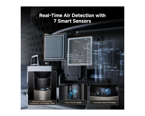 Sedem visoko natančnih senzorjev v realnem času spremlja kakovost zraka. Podatke lahko spremljate na LCD-zaslonu ali prek aplikacije Dreame, kjer lahko tudi nastavljate način delovanja, vlažnost in temperaturo.