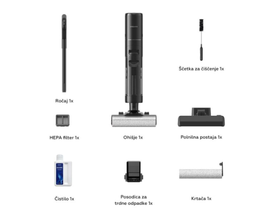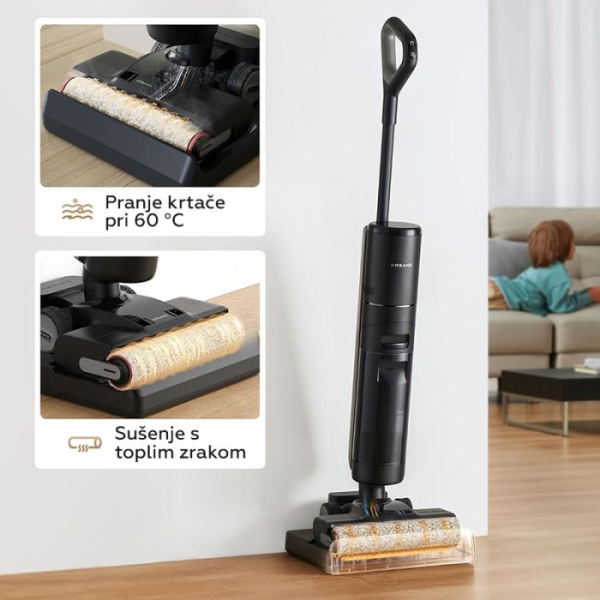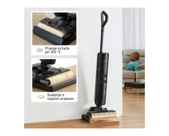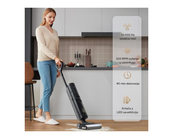 60 °C pranje krtače, 30 min sušenje s toplim zrakom, samočistilni sistem z dvojnim vrtenjem, 18 kPa sesalna moč, dvojno čiščenje robov, pogonski sistem GlideWheel, LED osvetlitev krtače, samodejna prilagoditev sesalne moči.