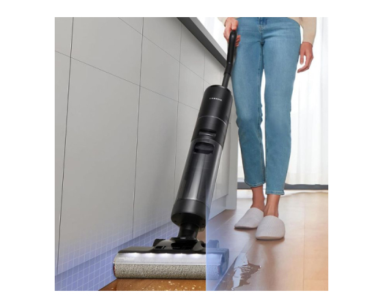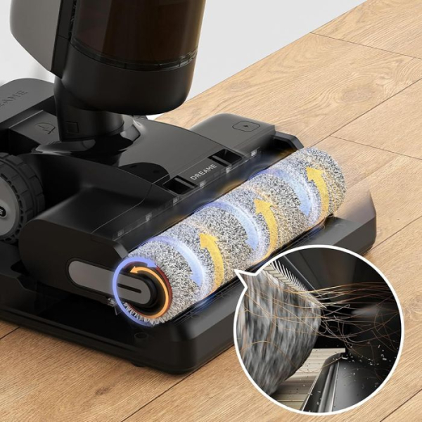Krtača temeljito čisti ob zidnih letvah in celo v ozkih kotih, pri čemer tla popolnoma očisti.