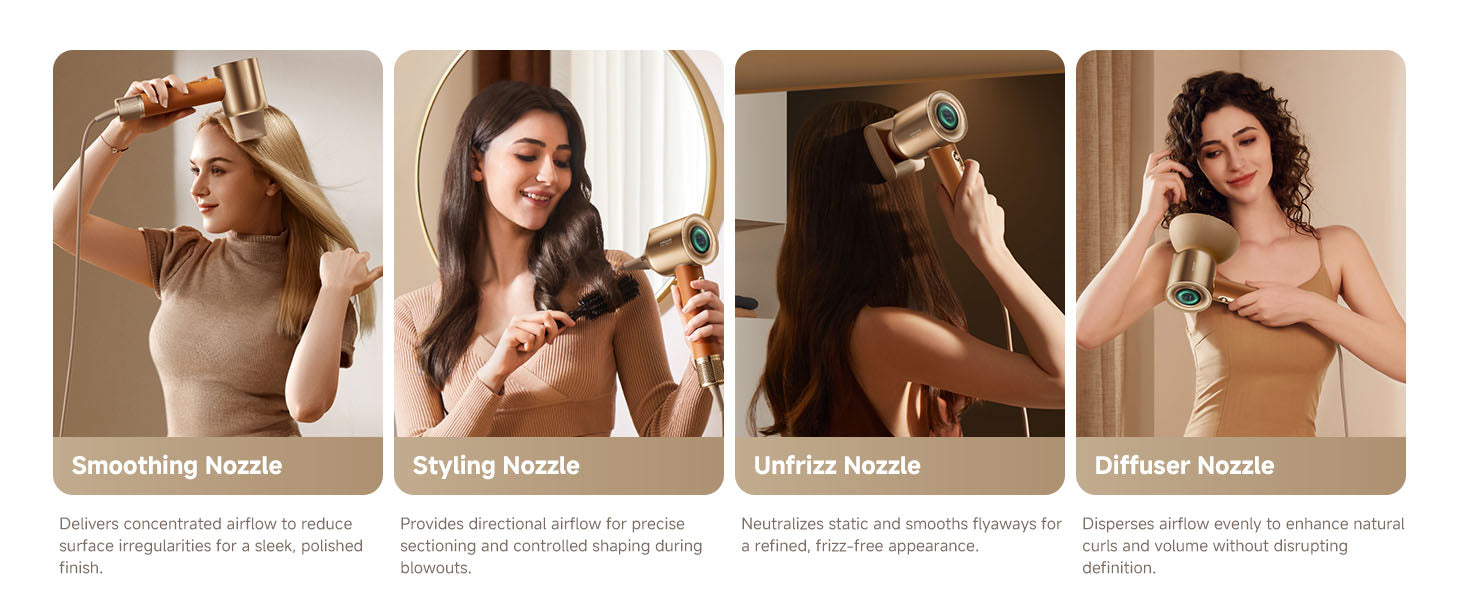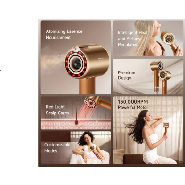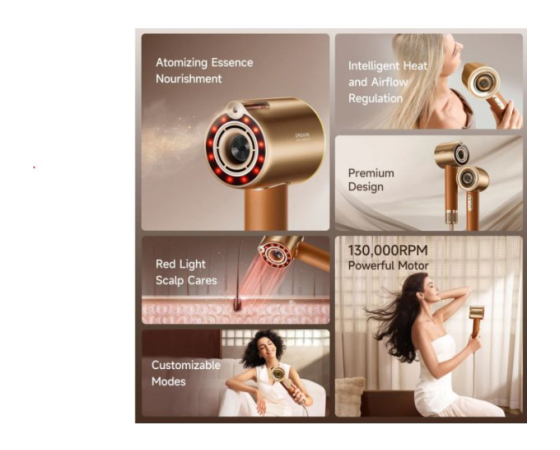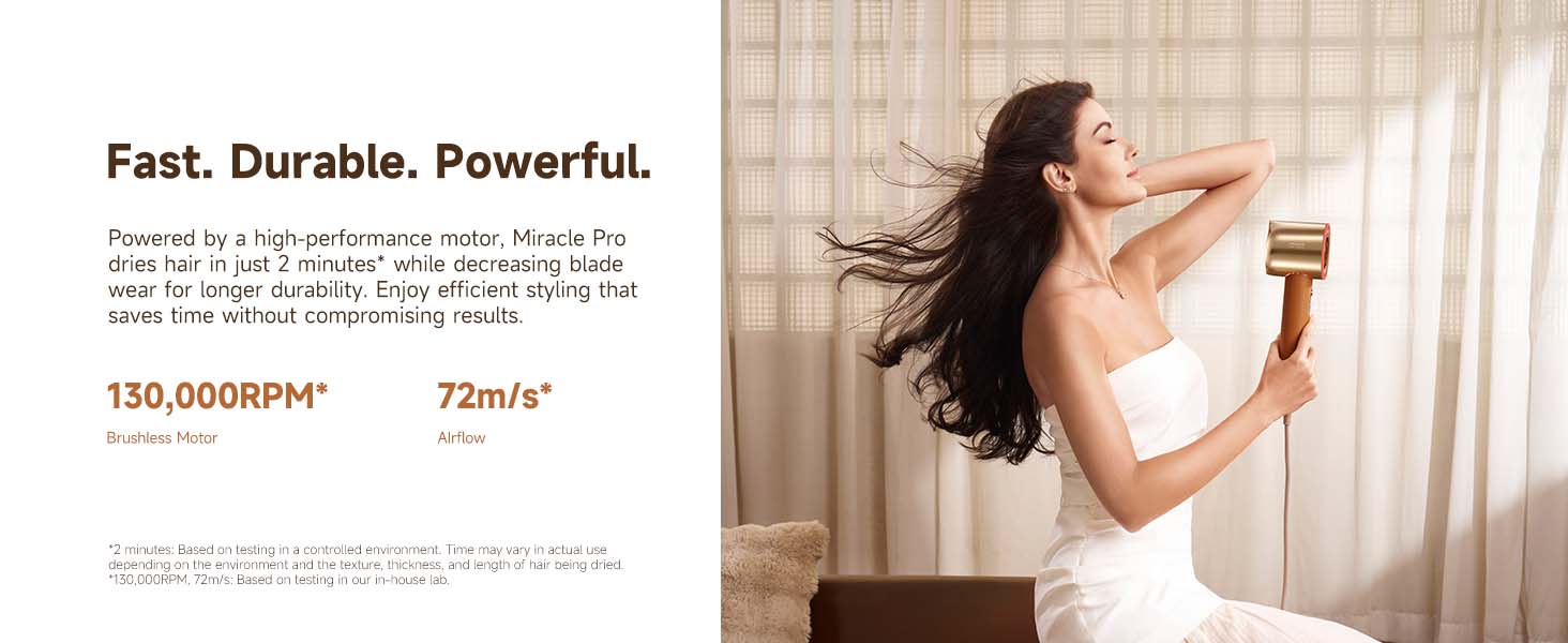 Zasnovan za hitro sušenje (npr. do ramen segajoči lasje v samo dveh minutah), ob ohranjanju zdravega videza las in njihove sijaja.