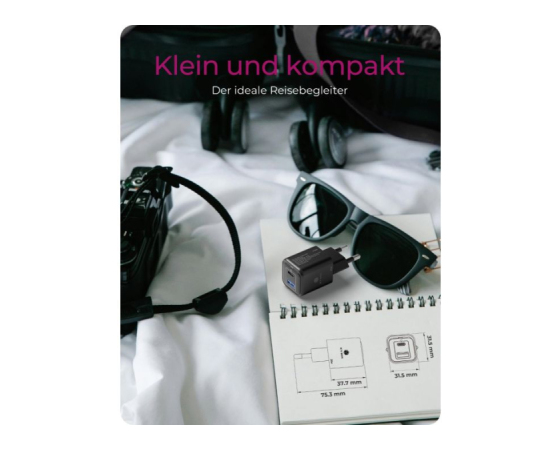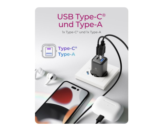 Omogoča hkratno polnjenje dveh naprav (USB-C + USB-A) pri skupni moči 20 W