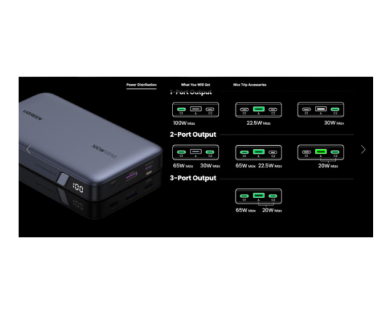 Ta zmogljiva 100-vatna naprava Power Bank za hitro polnjenje, opremljena z dvema priključkoma USB C (USB C1 100 W + USB C2 30 W) in enim 22,5 W priključkom USB A, lahko hitro napolni 3 naprave hkrati. Macbook Pro 16" je mogoče napolniti do 42% v samo 30 minutah prek OUT1, iPhone 15 pa lahko hitro napolni do 60% v 30 minutah. Manj časa za čakanje, več časa za uživanje