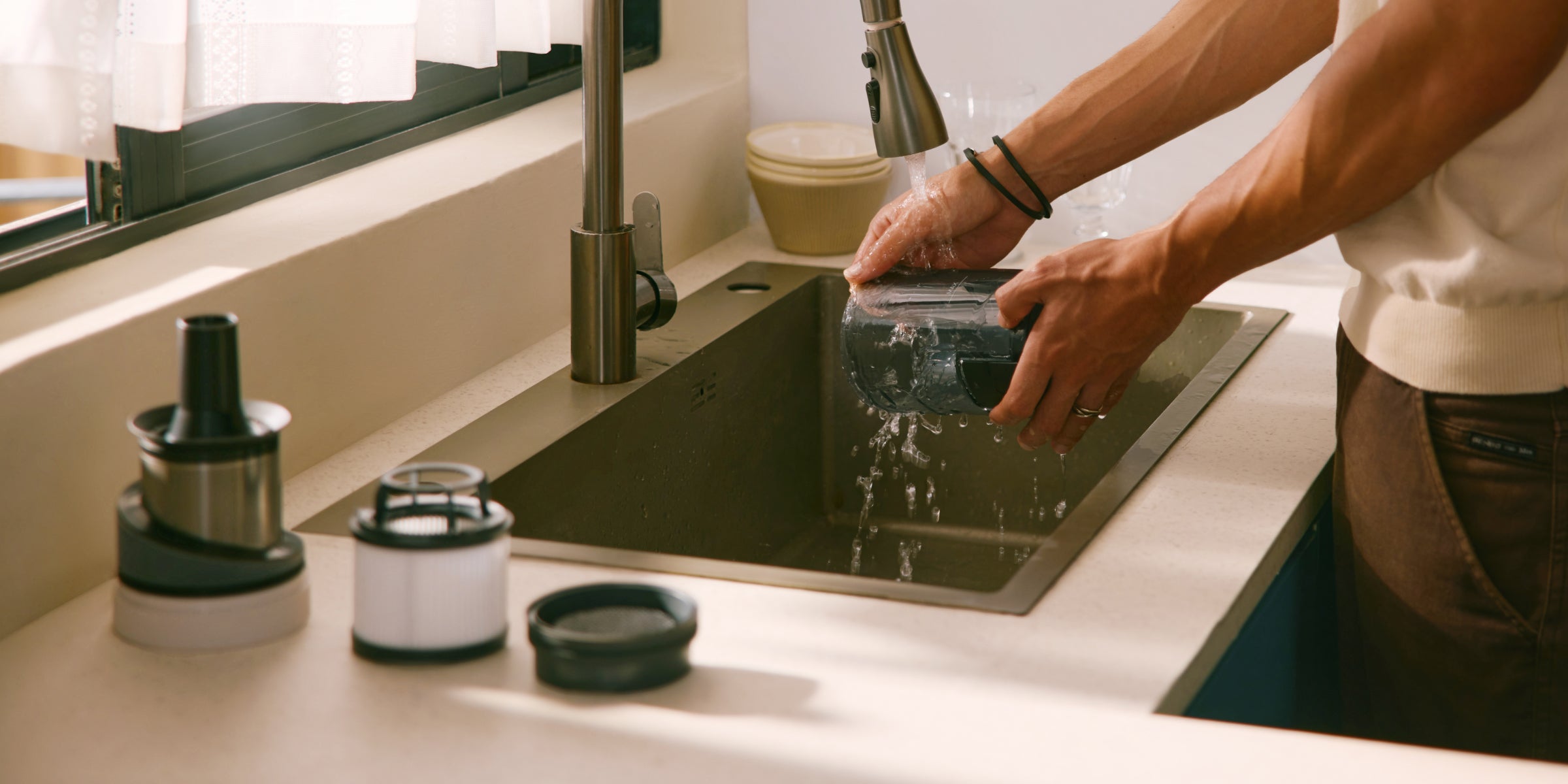 Pralna posoda za prah in filtri omogočajo enostavno čiščenje ter pomagajo ohranjati učinkovito delovanje sesalnika skozi čas.