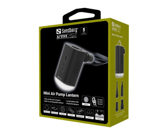 Podatki o pakiranju: 1x Sandberg Mini Air Pump Lantern, 1x polnilni kabel USB-C na USB-A (0,3 m), 4x nastavki