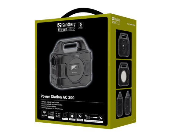 Sandberg Power Station 300 AC omogoča zanesljivo napajanje različnih naprav tudi tam, kjer ni dostopa do električnega omrežja. Vgrajena baterija visoke kapacitete zagotavlja dovolj energije za prenosnike, telefone, manjše gospodinjske naprave in drugo elektroniko. Naprava vključuje klasično AC vtičnico za priklop standardnih naprav ter več USB izhodov za neposredno polnjenje mobilnih naprav.
