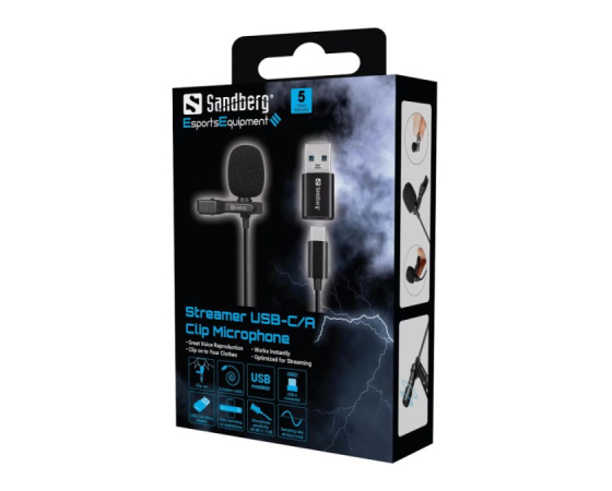 Podatki o pakiranju: 1x Sandberg Streamer USB Clip Microphone, 1x sponka, 1x torbica za shranjevanje, 1x adapter USB-C na USB-A, 1x navodila za uporabo