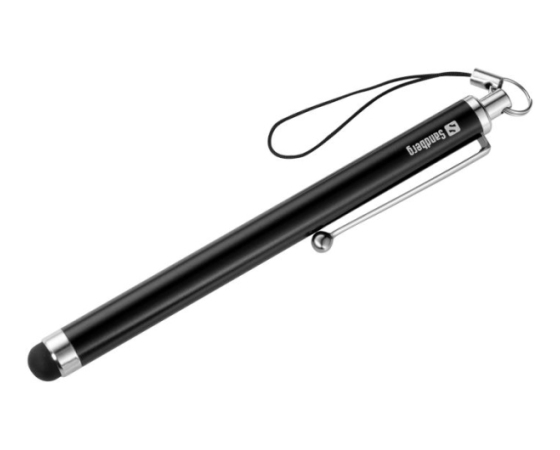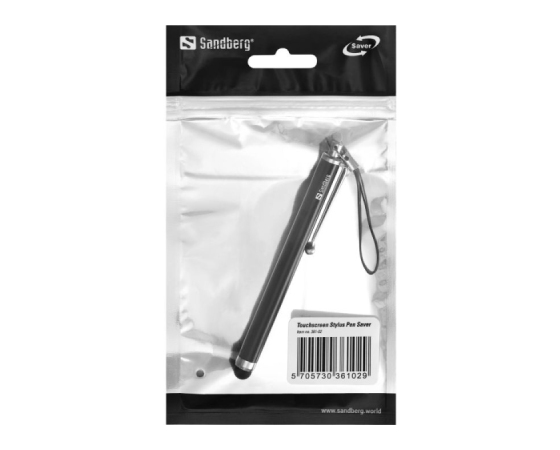Sandberg Touchscreen Stylus Pen Saver je Kovinsko pisalo z gumijasto konico. Pisalo deluje točno tako kot bi vaš prst na katerem koli zaslonu na dotik. Gumijasta konica omogoča natančnejši vnos, kot če uporabljate prste. Zelo priporočljivo tudi takrat, ko morate uporabljati rokavice. Lastno pisalo pomeni, da vam ni treba uporabljati prstov za, na primer, podpisovanje prejema paketa na prenosnem terminalu, zato se lahko tako izognete morebitnim okužbam. Pisalo lahko s paščkom zlahka pritrdite, denimo, na svoj obesek za ključe ali pritrdilno verižico.