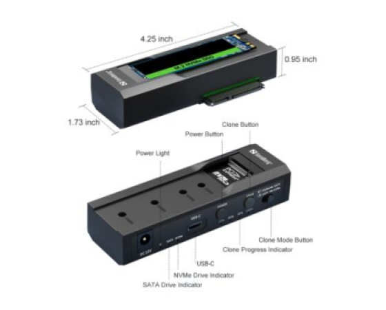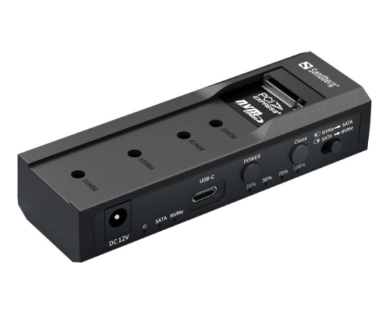 Sandberg USB 3.2 Cloner & Dock za M2 + NVMe + SATA priklopna in klonirna postaja je napreden pripomoček za profesionalce, ki želijo enostavno klonirati SSD disk brez uporabe računalnika. Vstavite dva M.2 NVMe SSD diska in s pritiskom na gumb začnite proces kloniranja. Poleg funkcije samostojnega kloniranja služi tudi kot zunanji dock, saj omogoča dostop do enega ali dveh diskov prek hitrega USB-C 3.2 Gen 1 vmesnika. Podpira dolžine diskov do 2280 in zagotavlja visoke hitrosti prenosa. Idealen je za IT serviserje, sistemce ali napredne uporabnike.