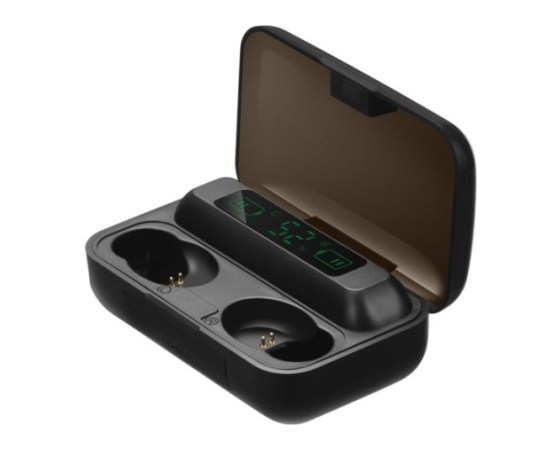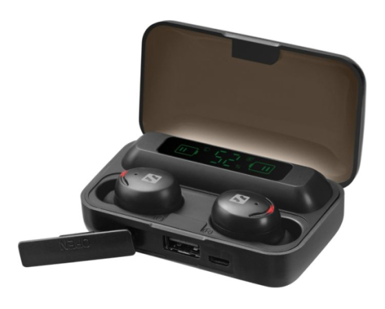 Vsebina paketa: brezžične slušalke + polnilno ohišje s funkcijo prenosne baterije, 3 pari zamenljivih ušesnih čepkov (S/M/L), USB polnilni kabel (20 cm), navodila za uporabo