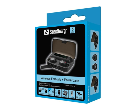 Sandberg Wireless Earbuds + Powerbank so elegantna in funkcionalna rešitev za mobilne uporabnike. Brezžične slušalke z Bluetooth 5.1 podpirajo TWS stereo zvok na razdalji povezave do 10 m ter multi‑point povezljivost. Vsaka slušalka ima baterijo 50 mAh za do 6 ur neprekinjega delovanja ter do 280 ur v pripravljenosti. Polnilni etui z zmogljivostjo 2000 mAh služi tudi kot prenosna baterija za telefon ali drugo USB napravo. Vgrajen zaslon prikazuje stanje napolnjenosti ohišja, komplet pa vključuje zamenljive ušesne čepke in USB kabel za polnjenje.