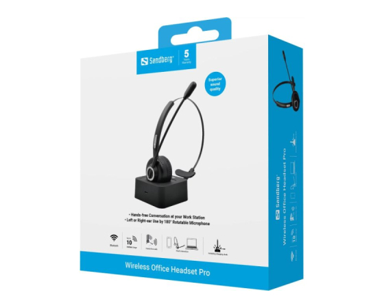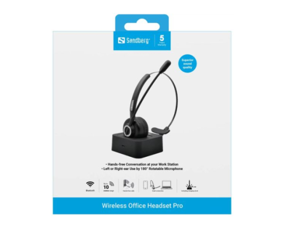 Podatki o pakiranju: 1x Sandberg Wireless Office Headset Pro, 1x polnilna postaja, 1x polnilni kabel USB (80 cm)