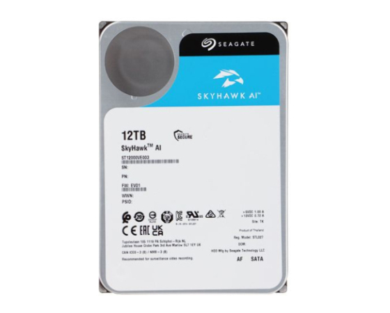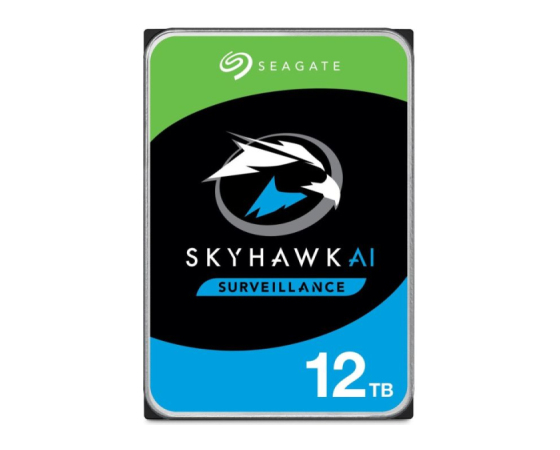 Seagate SkyHawk AI (ST12000VE003) je zmogljiv 3,5-palčni notranji disk s kapaciteto 12 TB, namenjen profesionalnim video nadzornim sistemom, vključno z AI analitiko. Povezuje se prek SATA 6 Gb/s in uporablja tehnologijo CMR ter helično ohišje za učinkovito delovanje 24/7 z letno obremenitvijo do 550 TB. Disk podpira do 64 HD kamer in 32 AI tokov, zahvaljujoč naprednim senzorjem AO (RV) ter ImagePerfect AI firmwaru, kar zagotavlja nemoten video brez izgube posameznih okvirjev. Vključena je tudi zaščita podatkov z SkyHawk Health Management sistemom. Združljiv je z NVR/DVR rešitvami, QNAP in Synology, ter drugimi vodilnimi platformami.
