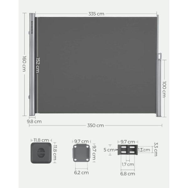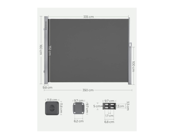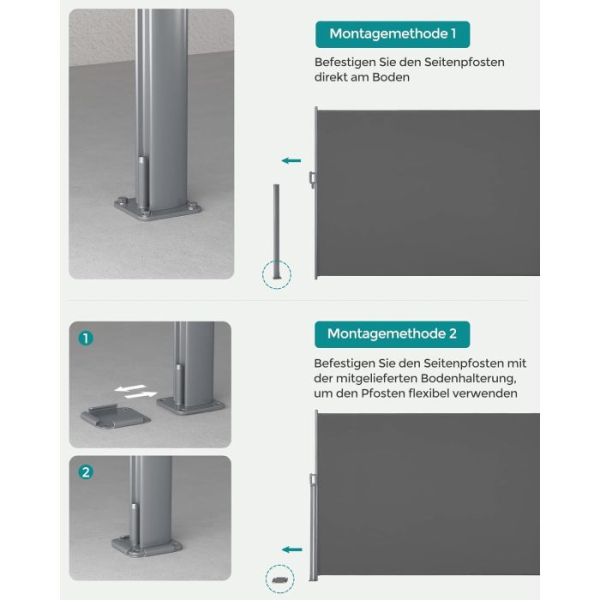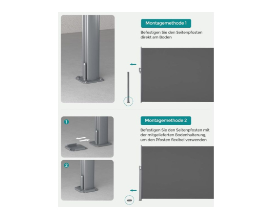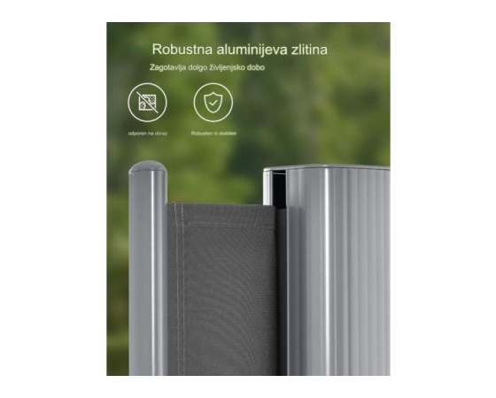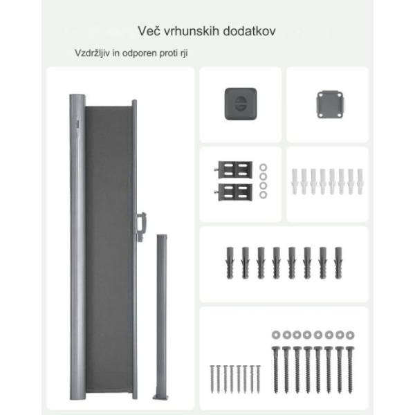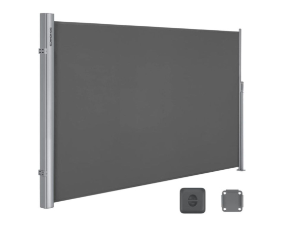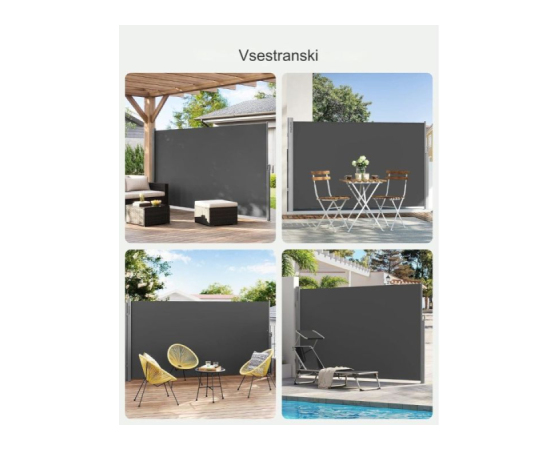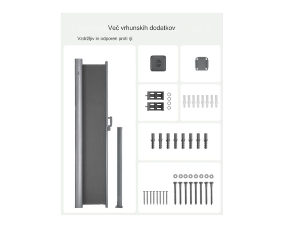 Uživajte v zajtrku ali kosilu brez radovednih pogledov sosedov. Poleti izkoristite hladilno senco in zaščito pred vetrom ter uživajte v poletnih temperaturah za sprostitev na terasi ali balkonu. prilagodljiva stranska markiza za na prostem in v zaprtih prostorihStransko markizo lahko uporabljate tudi v zaprtih prostorih, na primer v ordinaciji ali studiu. Vse, kar potrebujete, je trdna stena, na katero lahko pritrdite stransko roleto. S talnim nosilcem je mogoče stebriček tende tudi ponovno enostavno odstraniti, tako da na tleh ostane le nizek majhen nosilec, ki ni opazen.enostavna namestitev in rokovanjeMontažaje hitra in enostavna zaradi priloženih navodil za montažo. Ko je stranska markiza enkrat sestavljena, jo je enostavno uporabljati in prav tako hitro spet zvijete, ko je ne potrebujete več. Markizo zvijte ob močnem vetru, močnem dežju ali sneženju in dolgo uživajte v zaslonu za zasebnost.