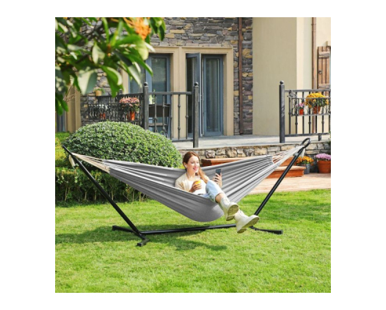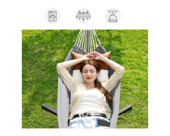 Pustite se zapeljati svojim mislim: Ne skrbite, da bi se stojalo za visečo mrežo prevrnilo. Podaljšane noge zagotavljajo dobro stabilnost stojala. Preprosto se ulezite in sprostite svoje telo in dušo
