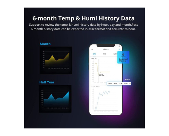 Podpora za preverjanje zgodovinskih podatkov o temperaturi in vlažnosti po urah, dnevih in mesecih. Podatke o zadnjih 6 mesecih zgodovine je mogoče izvoziti v formatu .xlsx in natančno na uro.