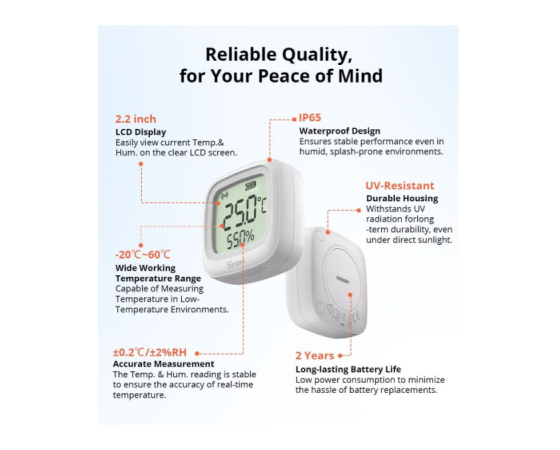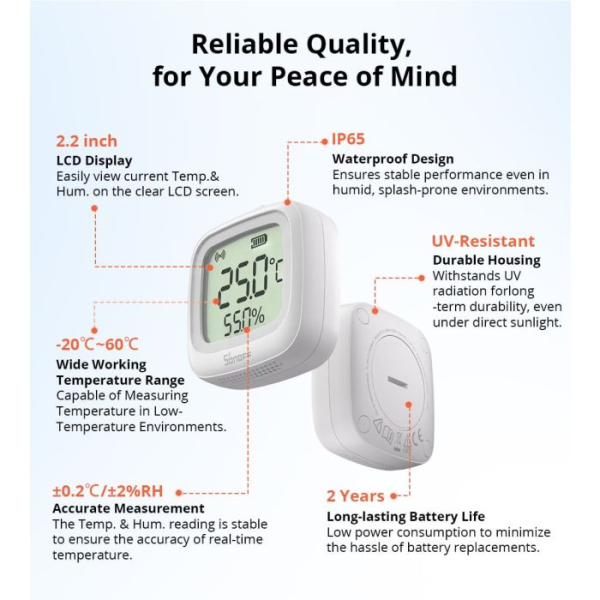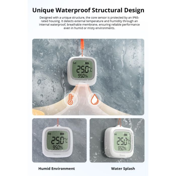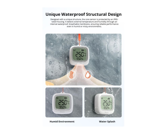 Zasnova z edinstveno strukturo omogoča, da je osrednji senzor zaščiten z ohišjem s certifikatom IP65. Zunanjo temperaturo in vlažnost zaznava preko notranje vodoodporne in zračne membrane, kar zagotavlja zanesljivo delovanje tudi v vlažnih ali meglenih razmerah.