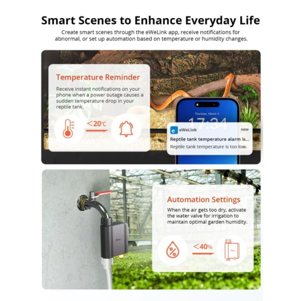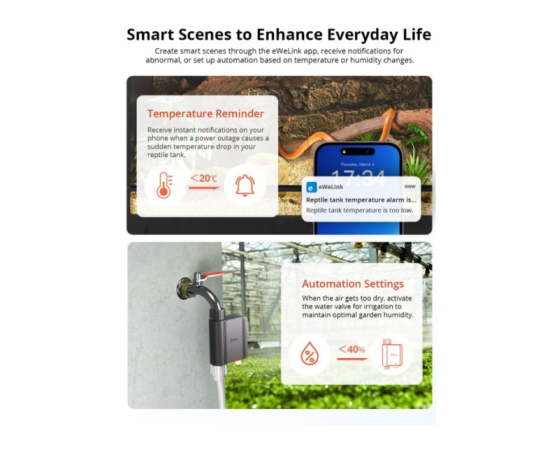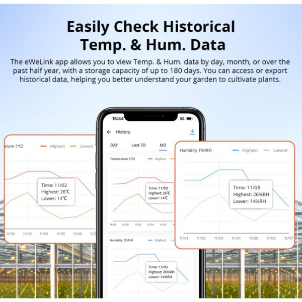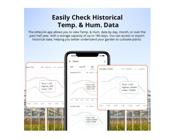 Aplikacija eWeLink omogoča pregled podatkov o temperaturi in vlažnosti po dnevih, mesecih ali za obdobje do pol leta nazaj, saj shrani do 180 dni podatkov. Dostopate lahko do zgodovine ali jo izvozite, kar vam pomaga bolje razumeti razmere na vrtu in prilagoditi oskrbo rastlin.