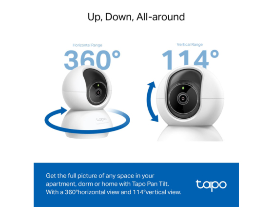 - Širok razpon gibanja: Uživajte v polnem 360-stopinjskem vodoravnem in 114-stopinjskem navpičnem razponu za panoramsko in nagibno premikanje, kar vam omogoča, da pokrijete večjo površino.