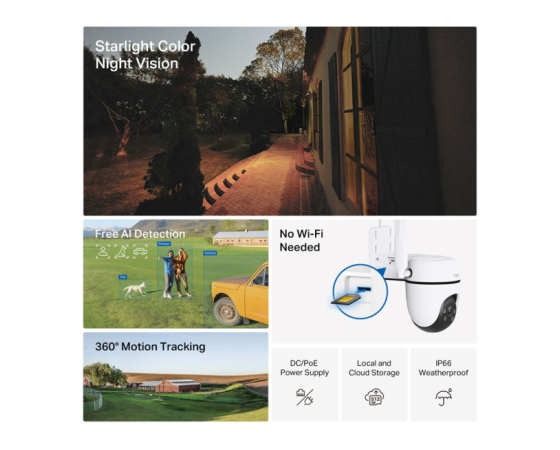 Tapo C501GW, podprt s TP-Linkovim strokovnim znanjem na področju 4G omrežij, se zanesljivo povezuje prek omrežij 4G LTE, kar je idealno za lokacije, kot so garaže, počitniške hiše, skladišča in kmetije, kjer stalen Wi-Fi ni na voljo. Preprosto vstavite 4G SIM kartico (ni priložena) za enostavno in brezskrbno nastavitev interneta.