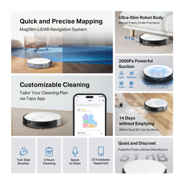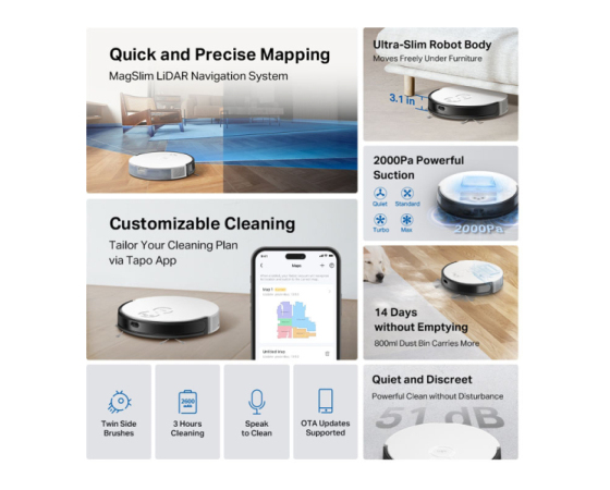 Serija Tapo RV20 poganja MagSlim LiDAR navigacija, ki je integrirala modul LiDAR v robotov sprednji del in s tem zmanjšala robota za 2 cm. Z vitko zgradbo zdrsne pod kavče, omare in postelje ter doseže skrito umazanijo in umazanijo.