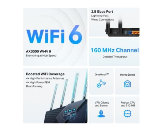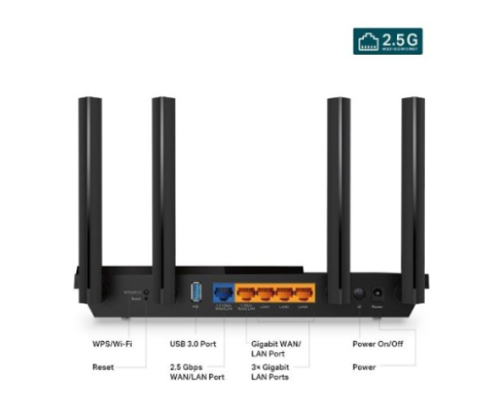 2.5G Multi-Gigabit Port: 1× 2.5 Gbps WAN/LAN vrata + 1× 1 Gbps WAN/LAN vrata + 3× Gigabit LAN vrata + 1× USB 3.0 vrata zagotavljajo največjo prilagodljivost in povečano prepustnost.