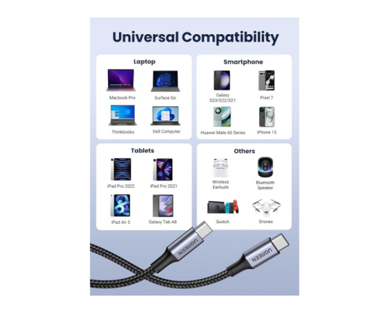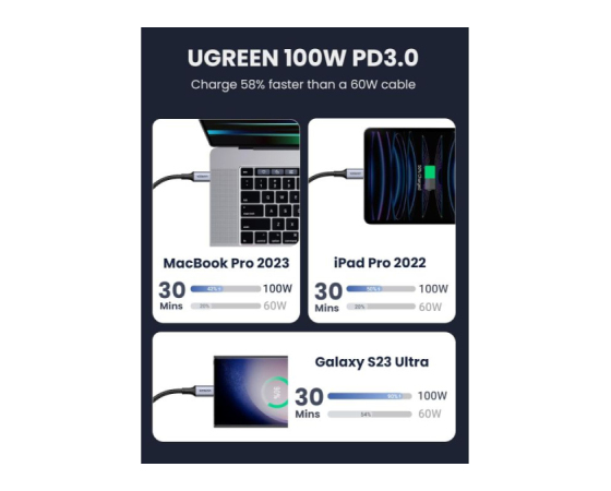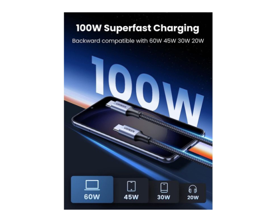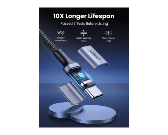 vgrajen pametni čip E-marker, kabel UGREEN USB C lahko poveča hitrost polnjenja za 80 % in stabilnost polnjenja za 90 %, kar vam zagotavlja varnejšo in stabilnejšo izkušnjo polnjenja.