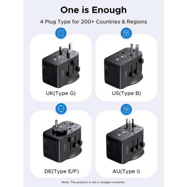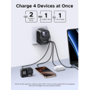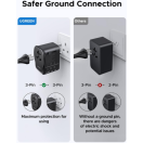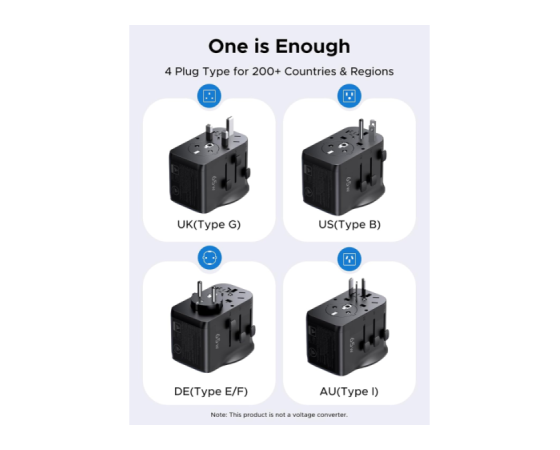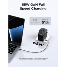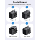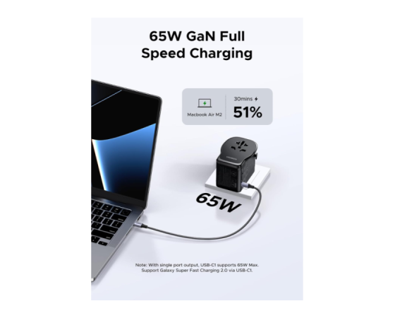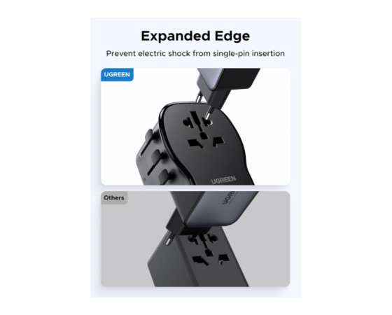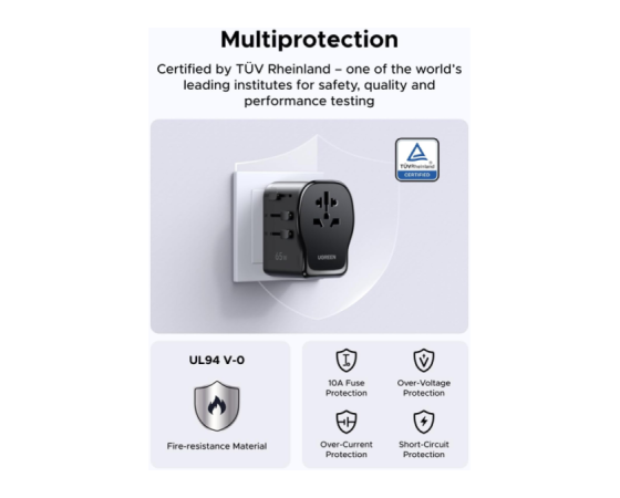 UGREEN 55001 (S550) je vsestranski univerzalni potovalni adapter z vgrajenim 65 W GaN polnilnikom, ki združuje kompaktno zasnovo, visoko moč in varnost. Opremljen je z dvema USB-C priključkoma, enim USB-A in univerzalno AC vtičnico, kar omogoča hkratno polnjenje več naprav kjerkoli na svetu.