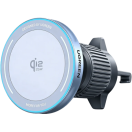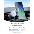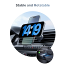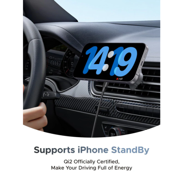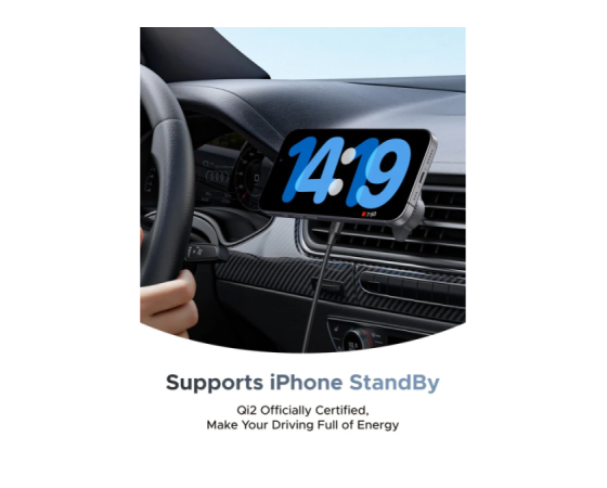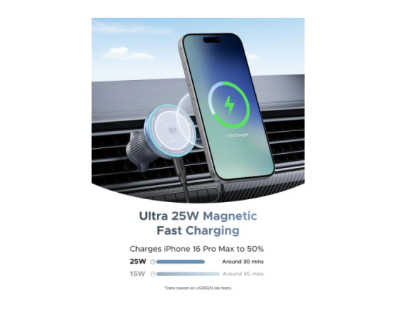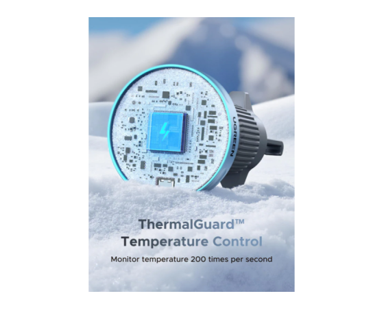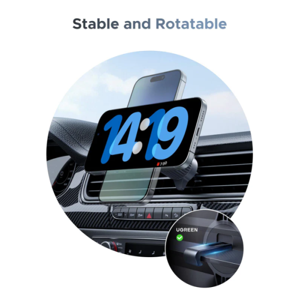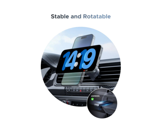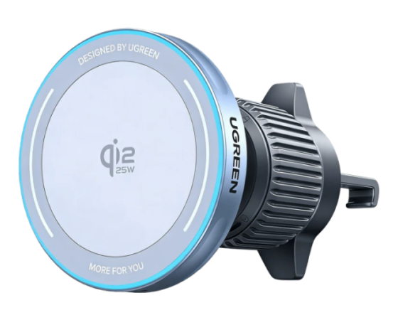 UGREEN 55967 je avtomobilski nosilec in brezžični polnilec, zasnovan za serijo iPhone z magnetno poravnavo. Podpira Qi2 brezžično polnjenje z močjo do 25 W, kar omogoča hitro polnjenje med vožnjo. Vgrajenih je 17 N52 magnetov, ki ustvarijo oprijem do 10 N in zagotavljajo stabilno pritrditev telefona tudi na neravnih cestah. Nastavljiva 360° vrtljiva glava omogoča uporabo telefona v pokončnem ali ležečem položaju za navigacijo, klice ali prikaz informacij. Sistem pritrditve na prezračevalno režo vključuje dodatni kavelj za stabilnost in ne ovira pretoka zraka. Tehnologija ThermalGuard z NTC senzorji spremlja temperaturo in skupaj z več varnostnimi zaščitami preprečuje pregrevanje, prenapetost in druge nepravilnosti med polnjenjem.