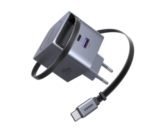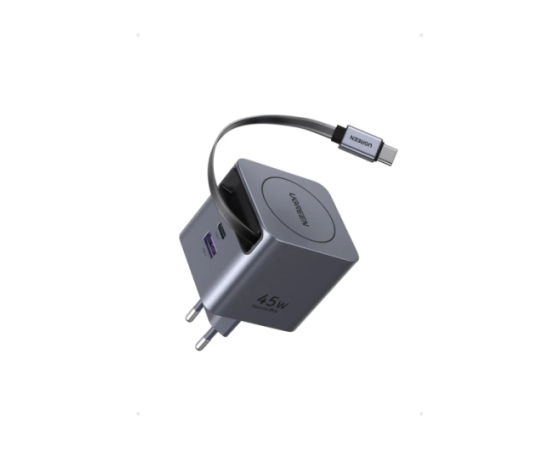 45W GaN hitri polnilec z izvlečnim kablom je polnilec podjetja UGREEN, ki ponuja učinkovito in prilagodljivo polnjenje za več naprav. Z vgrajenim izvlečnim kablom dolžine 0,7 metra lahko uporabnik nastavi dolžino v do osem različnih stopenj. Polnilec je prestal več kot 25.000 testov izvleka in več kot 10.000 testov upogibanja, kar zagotavlja vzdržljivost in enostavno uporabo.