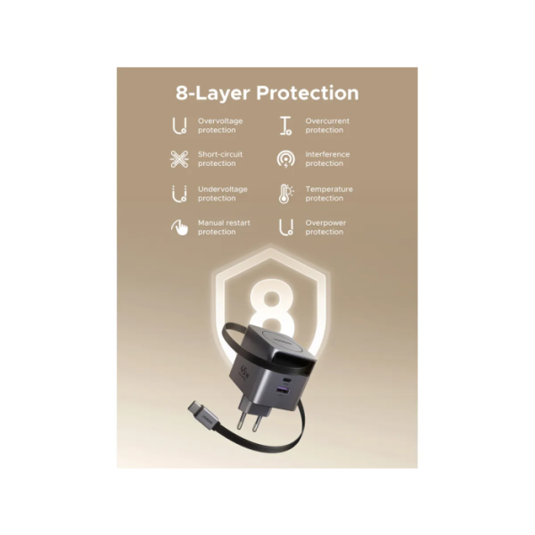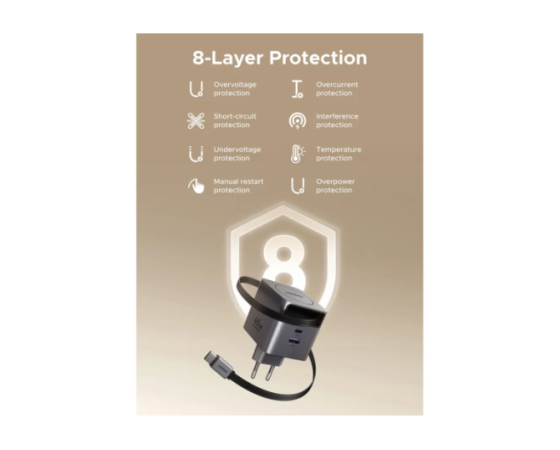 Polnilec ima tri različne priključke, ki omogočajo sočasno polnjenje do treh naprav, kar je priročno, ko je treba napajati več naprav hkrati. Tehnologija GaNInfinity™ zagotavlja 95 % učinkovitost in kompakten dizajn, ki je enostaven za prenašanje na poti. Polnilec vključuje osem plasti zaščite pred previsokim tokom, prenapetostjo, pregrevanjem in drugimi tveganji, medtem ko Thermal Guard™ spremlja temperaturo 200-krat na sekundo, da zagotovi stabilno in varno polnjenje.