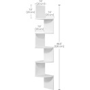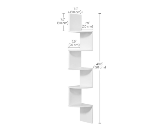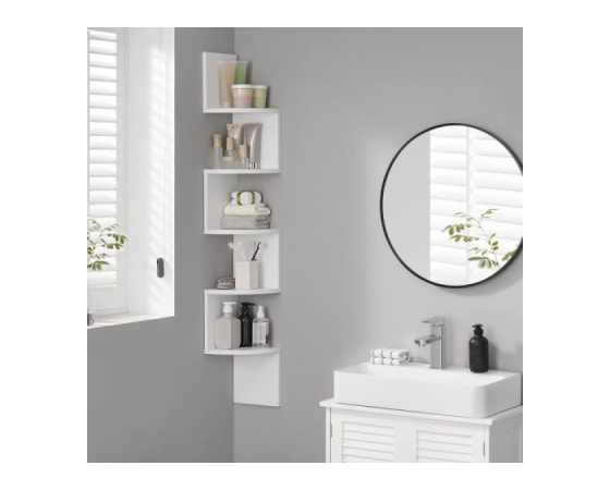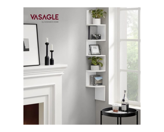 Izkoristite svoj kotiček z elegantnim in minimalističnim VASAGLE 5-nivojskim kotnim regalom. S svojo čisto belo mat površino in zaobljenimi robovi se lepo poda v vsak prostor – naj bo to dnevna soba, spalnica, otroška soba ali pisarna. Regal je idealen za razstavljanje knjig, dekorativnih predmetov, rastlin ali osebnih spominkov. Vijači se neposredno na steno in tako ustvari stabilno ter varno konstrukcijo, ki ne zasede talnega prostora. Kompaktna velikost omogoča uporabo tudi v manjših stanovanjih ali ozkih hodnikih.