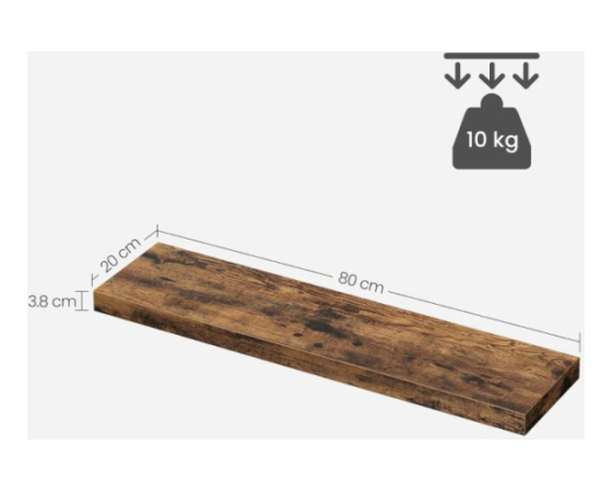 Z dimenzijami 20 × 80 × 3,8 cm in nosilnostjo do 15 kg ponujata popoln prostor za uokvirjene slike, knjige, majhne rastline ali druge dekorativne predmete. Izdelani iz kakovostne MDF plošče in okrepljeni s kovinskimi nosilci, zagotavljajo trdnost in dolgotrajno uporabo.