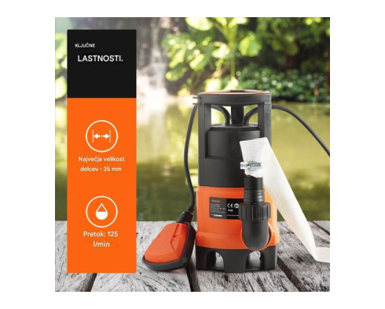 Z največjo zmogljivostjo odvajanja 7.500 L/h ta 400 W motorna črpalka hitro izčrpa vodo iz bazenov, masažnih kadi, ribnikov, poplavljenih prostorov in drugih vodnih površin do globine 7 m (največja višina dviga od vodne gladine: 5 m).