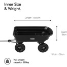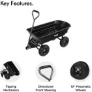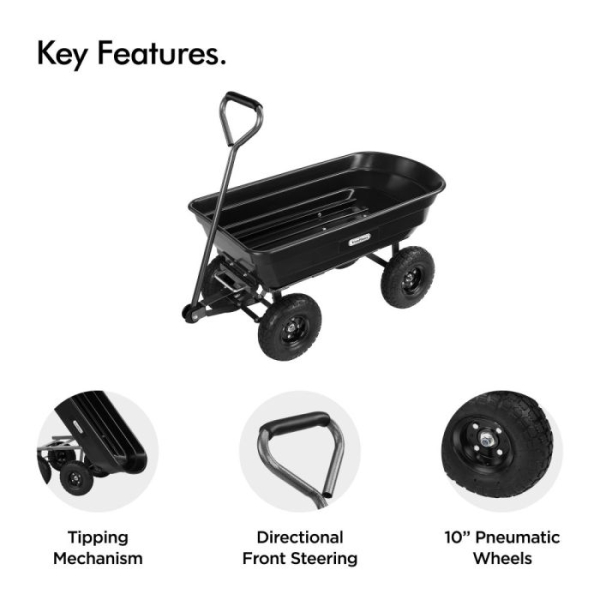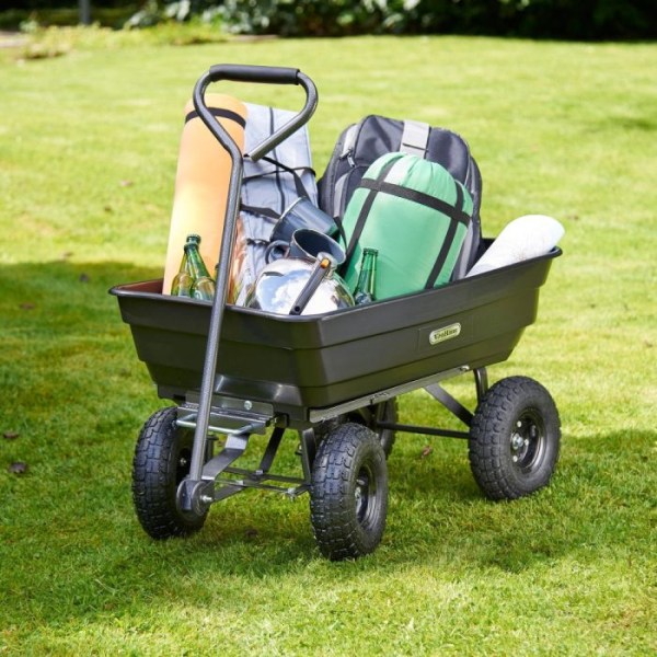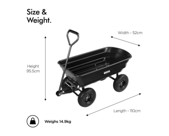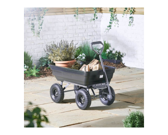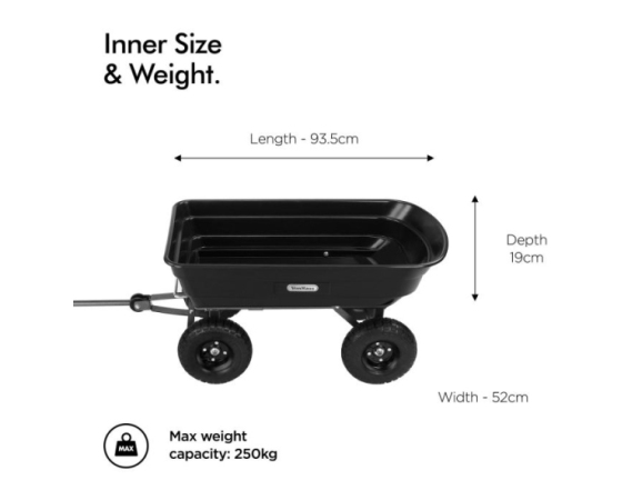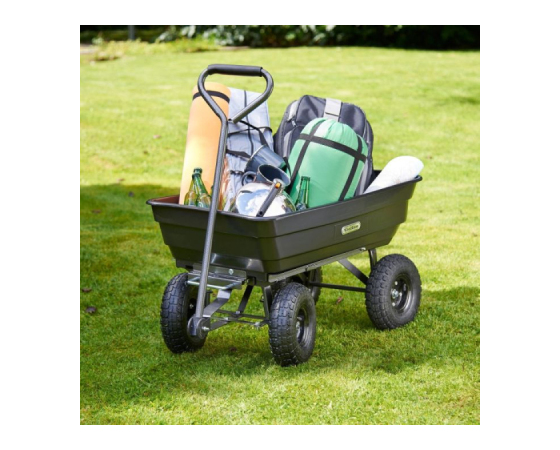 Ta priročen vrtni pomočnik se ponaša z močno plastično kadjo prostornine 75L, transportira pa lahko do 250kg tovora, oziroma v primeru uporabe kiperja do 180kg.