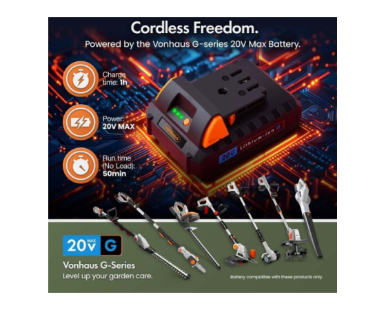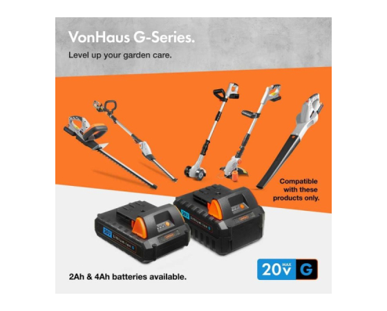 To nadomestno baterijo lahko uporabljate z vsemi izdelki iz 20V linije vrtnih orodij VonHaus G-series, ki vključuje škarje za živo mejo, obrezovalnik trave, teleskopski obrezovalnik, puhalnik listja in druge. Od vrha žive meje do tlakovanega dvorišča – poskrbite, da bo vaš vrt urejen od začetka do konca.