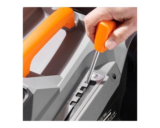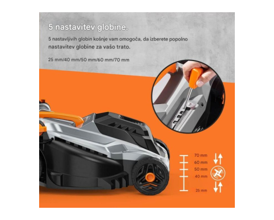 Z enoročno nastavitvijo višine lahko trato prilagodite svojim željam. Glede na vrsto trave, videz in stopnjo vzdrževanja preprosto izberite eno od višin: 25 mm, 40 mm, 50 mm, 60 mm ali 70 mm. Nastavitev poteka brez orodja.