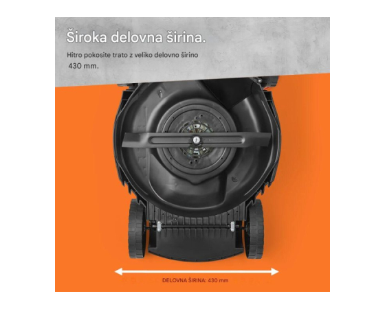 Z delovno širino 430 mm omogoča rotacijska kosilnica hitro in učinkovito košnjo z manj prehodi.