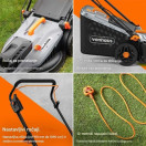 Ergonomski ročaj je prav tako nastavljiv po višini in ga je mogoče popolnoma zložiti za enostavno shranjevanje kosilnice. Mehka prevleka ročaja zagotavlja udobje med košnjo.