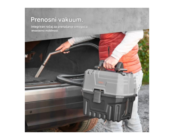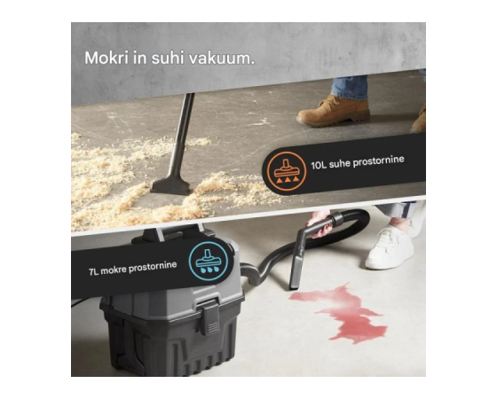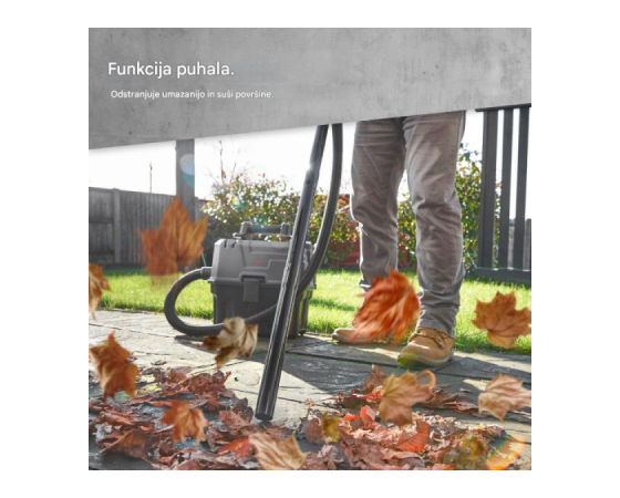 Velika posoda s prostornino 15 litrov (10 l za suho, 7 l za mokro) vam omogoča daljše sesanje brez prekinitve zaradi praznjenja. Poleg sesanja lahko s preklopom na način blower (pihanje) preprosto odstranite listje ali osušite površine.